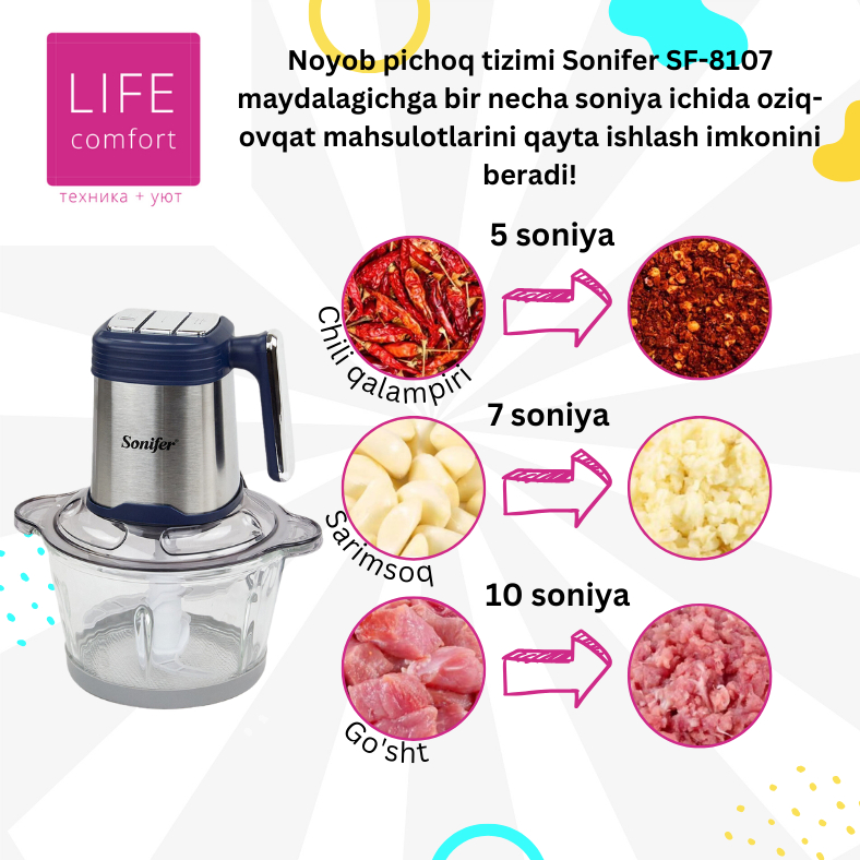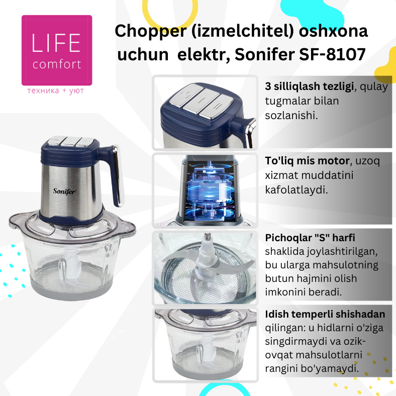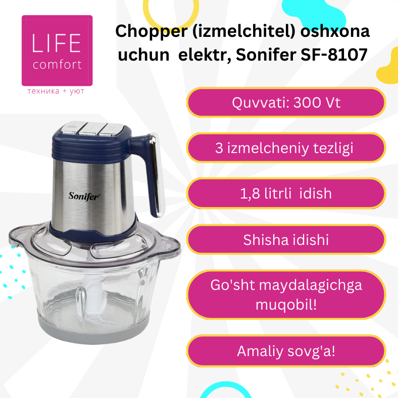 Sizning oshxonangiz uchun innovatsion echim-sonifer SF-8107 elektr oshxona maydalagich. Ushbu kuchli va ko'p qirrali qurilma bilan pishirish zavq bag'ishlaydi: