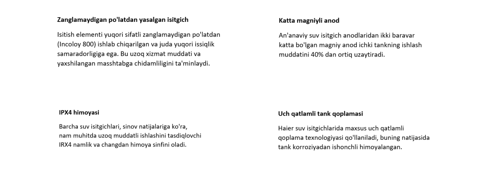 - Maksimal suv isitish harorati: +75 °C