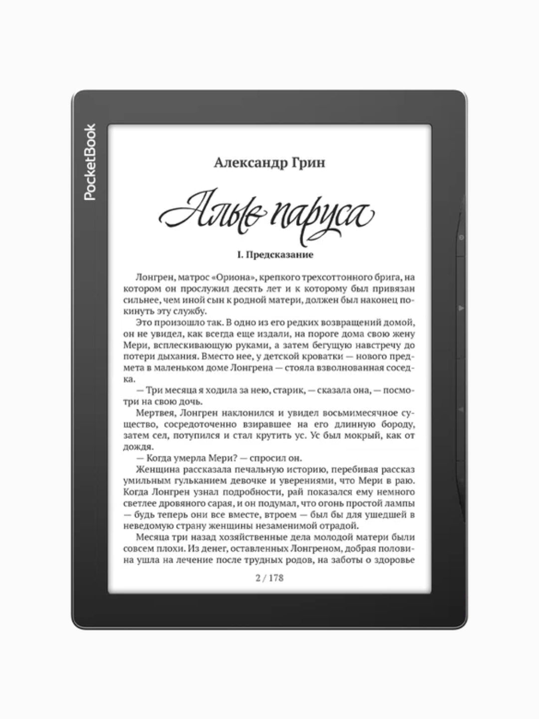 - Raqamli kitob PocketBook 970 - 9,7 diagonali bo'lgan qora va oq o'quvchi. Katta ekran imkon qadar yuqori sifatli qog'ozga o'xshaydi, yuqori aniqlikda - va shuning uchun nostandart formatdagi adabiyotlar uchun ideal