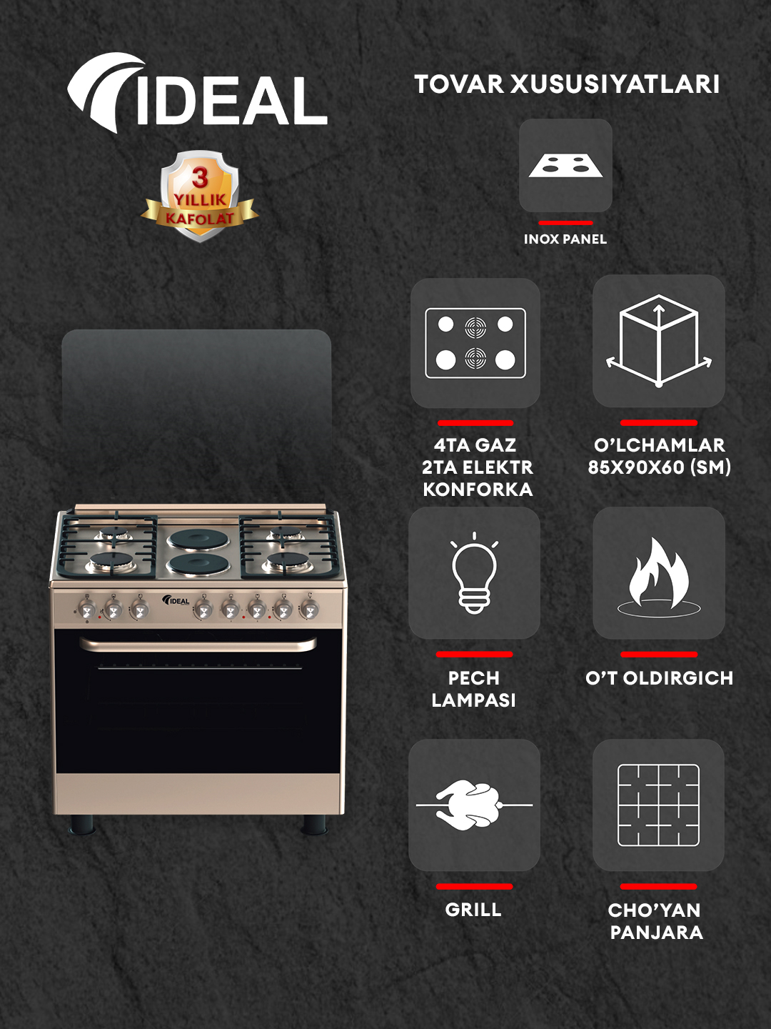 Gaz plita Ideal IEL9022, 4+2 konforkali, pech hajmi 106 litr, 90x60