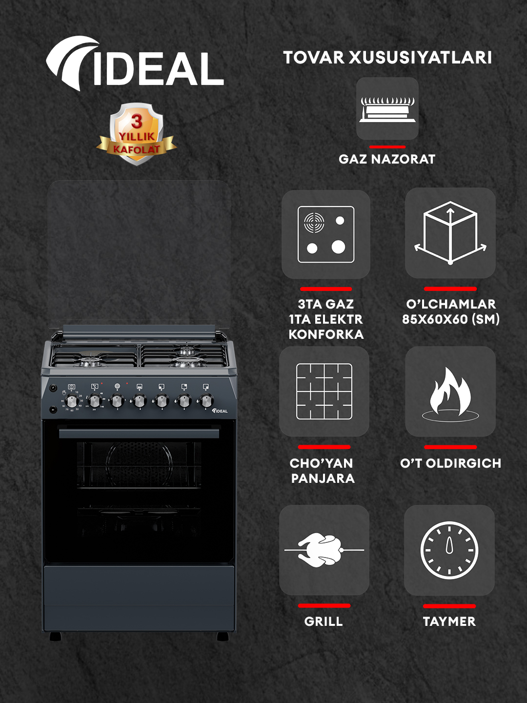 Gaz plita Ideal L405GK, 3+1 konforkali, pech hajmi 65 litr, 60 * 60