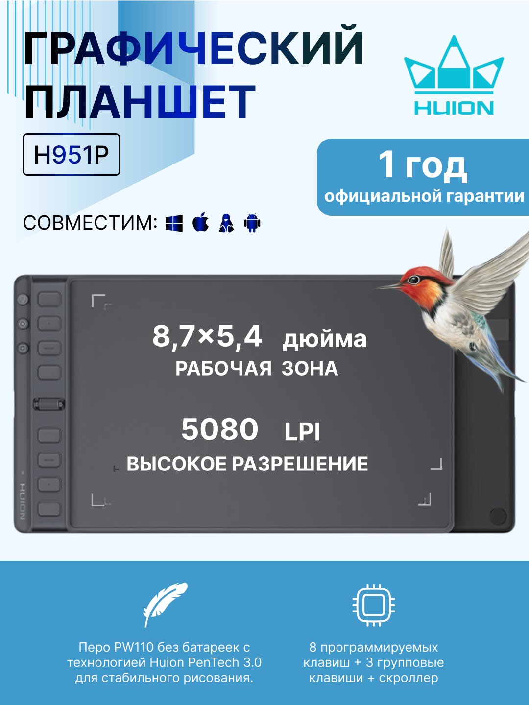 Grafik planshet Huion H951P, 8.7"x5.4", qora