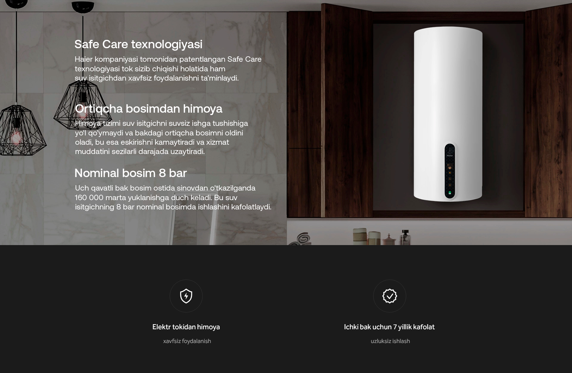 Tankning uch qatlamli qoplamasi uni korroziyadan himoya qiladi, bu esa Haier suv isitgichini ishlatishda juda ishonchli qiladi