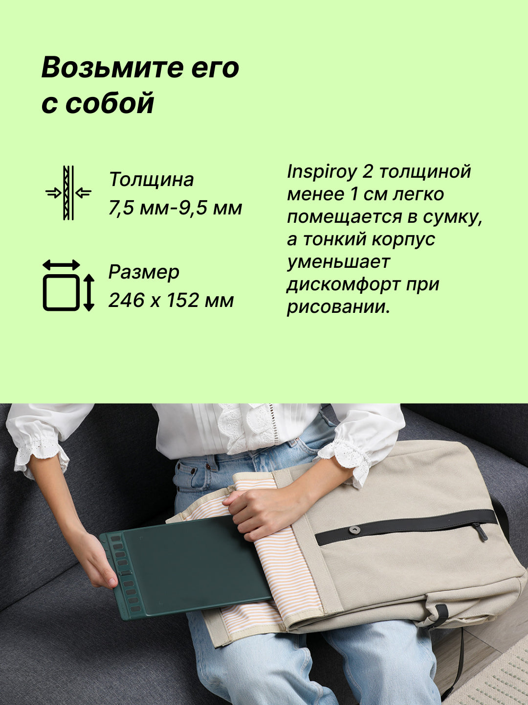 Huion Inspiroy 2 ning umumiy hajmi, qalinligi va og‘irligi oldingi modelga nisbatan optimallashtirilgan. Rasm chizishda bilakning noqulayligini kamaytirish uchun uning qalinligi atigi 7,5~9,5 mm. Bundan tashqari, u foydalanuvchining sumkasida ko‘p joy egallamaydi, shuning uchun uni uydan maktabga yoki ofisga olib borish oson.