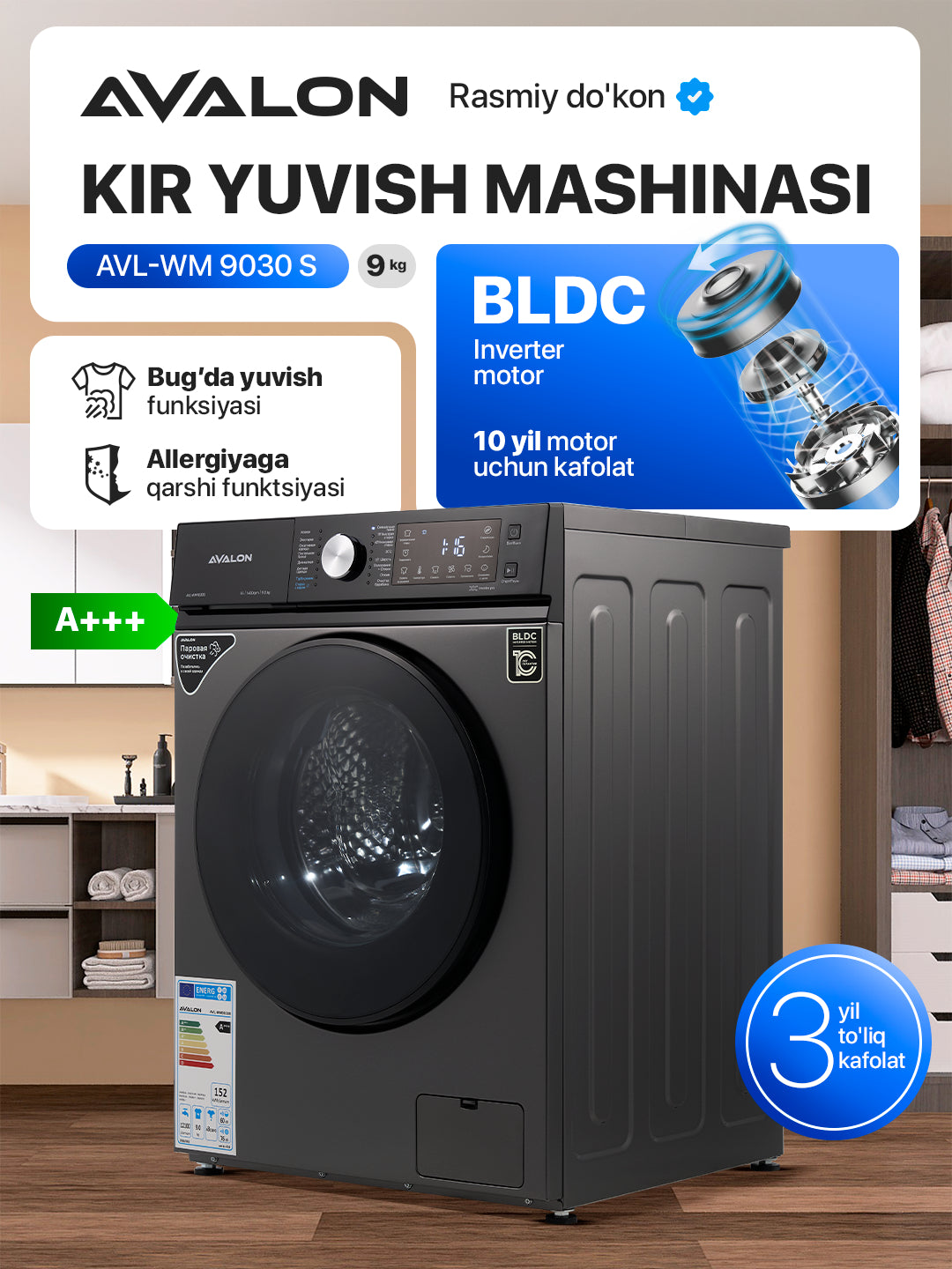 AVALON kir yuvish mashinalari nafis dizayn va ilg'or texnologiyani o'zida mujassam etgan. Ushbu kir yuvish mashinasi energiya samaradorligi A+++ sinfiga tegishli. Narsalarni samarali tozalash uchun mo'ljallangan. Ushbu model innovatsion BLDC inverter motoriga ega. U uzoq muddatli ishlash uchun mo'ljallangan, energiyani tejamkorlik bilan ishlatadi va deyarli jim ishlaydi. Qo'shimcha xususiyat - Steam Bug' bilan tozalash