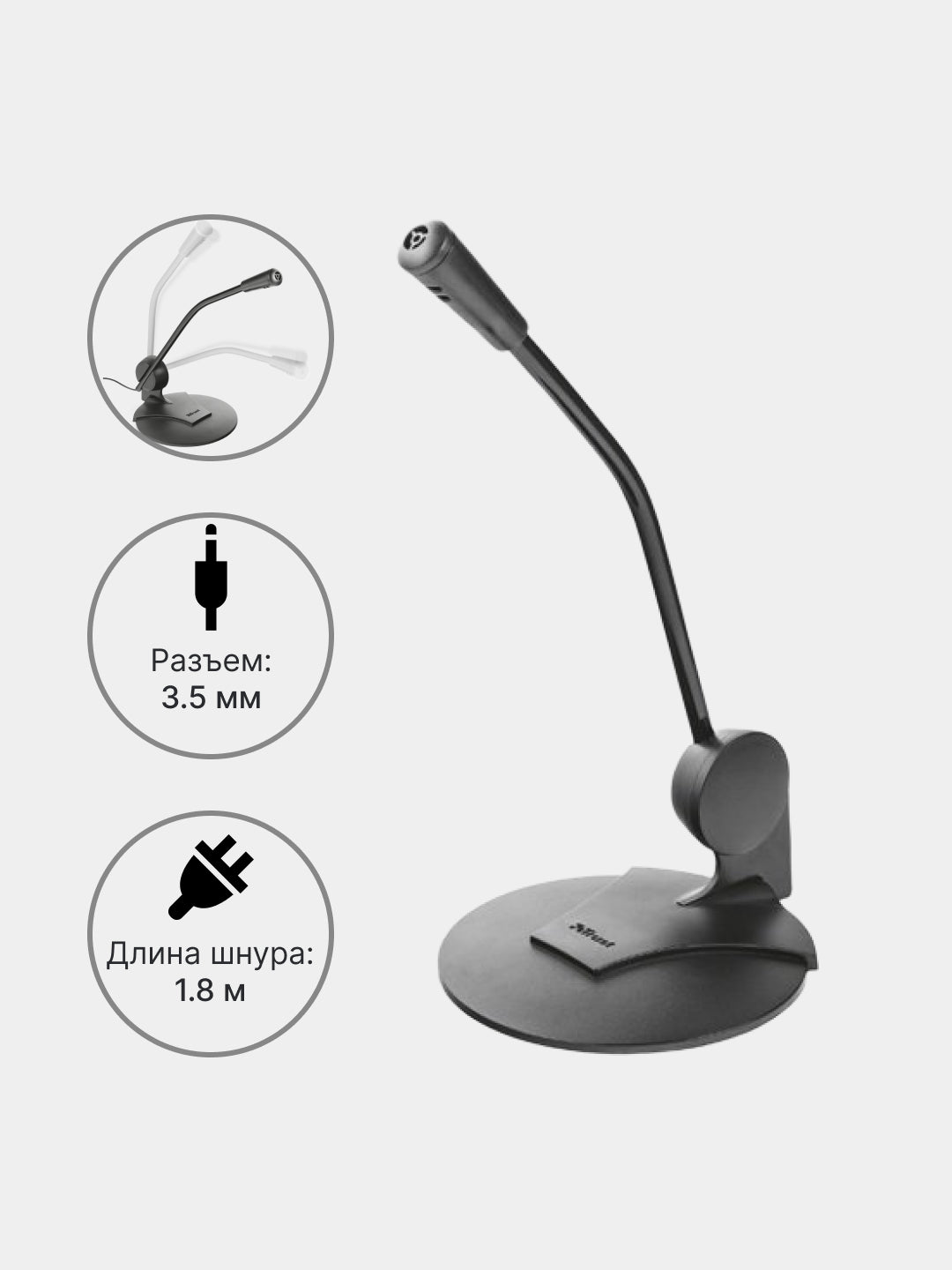 Stenddagi yuqori sezgir ish stoli mikrofoni. Suhbatlarda, o'yinlarda, qo'shiqlarda muloqot qilish uchun juda mos keladi: hamma sizni aniq eshitadi. 1,8 m uzunlikdagi kabel tufayli siz mikrofonni istalgan joyga qo'yishingiz mumkin.