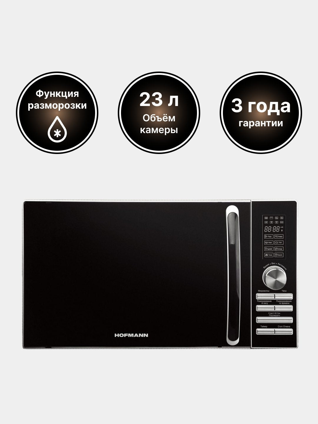 Hajmi: Hofmann MW823DHBKS/HF mikroto'lqinli pechining sig'imi 23 litr. Bu turli xil idishlarda tayyorlash va ovqatni isitish uchun keng joy beradi.