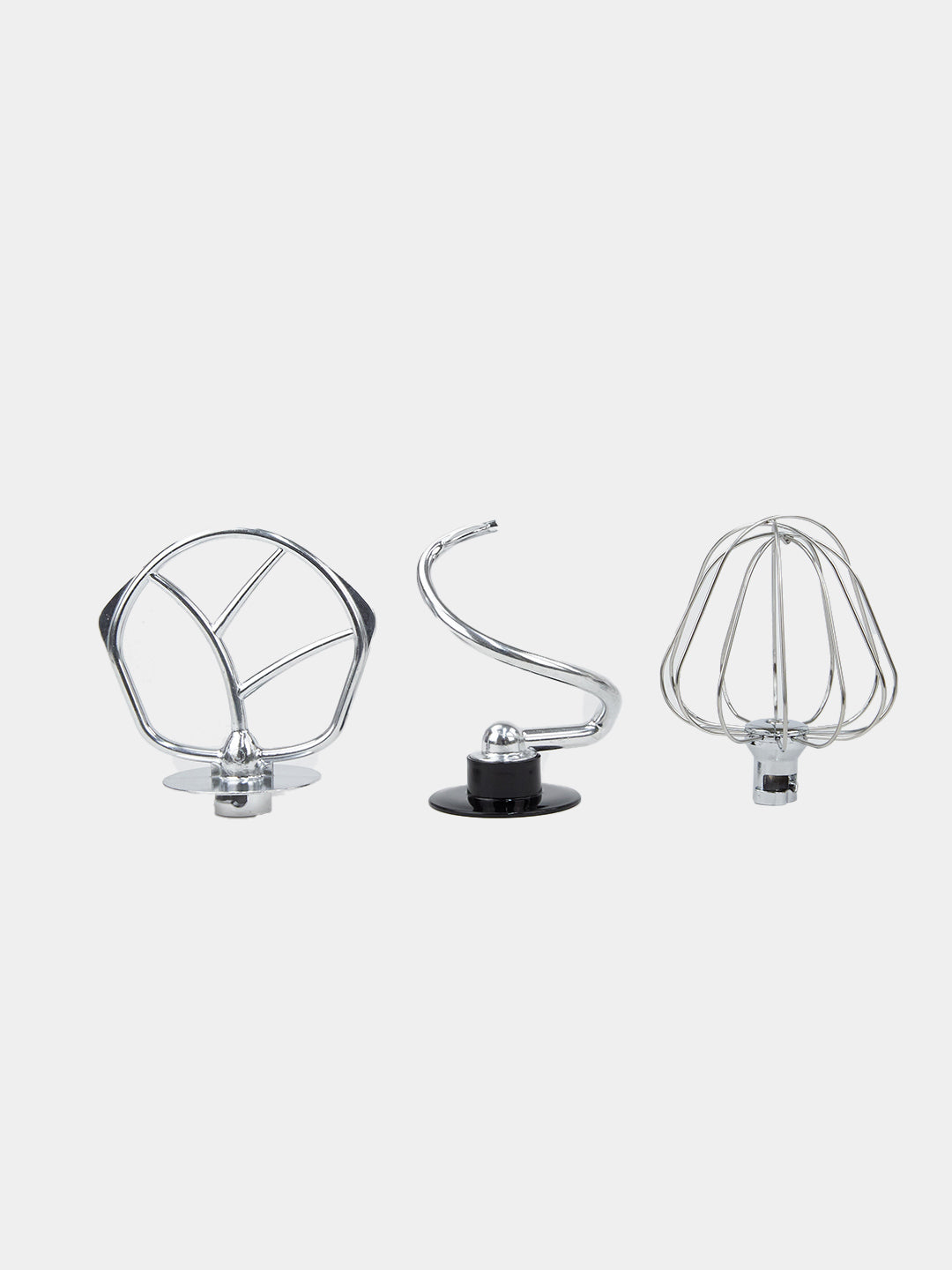 - Turli xil vazifalar uchun 3 ta nozul: etkazib berish to'plamida qamchilash uchun ko'pirtirish moslamasi, xamirni aralashtirish uchun ilgak va aralashtirish uchun tekis ko'pirtirish moslamasi mavjud bo'lib, bu sizga oshxonada turli xil vazifalarni osongina bajarishga imkon beradi.