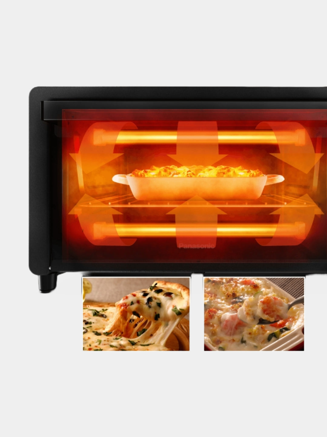 O'zining ixcham o'lchamiga qaramay, Panasonic NT-H900KTQ elektr pechi ko'plab taomlarni bemalol pishirishga yordam beradi. Yuqori va pastdagi ikkita isitish elementi sifatli pishirish uchun teng isitishni ta'minlaydi. Ichki kamera 9 litr hajmga ega. Aylanadigan boshqaruv vositalaridan foydalanib, siz harorat va ish vaqtini muammosiz sozlashingiz mumkin. Eshikdagi ikkita shisha va issiqqa chidamli materialdan yasalgan tutqich Panasonic NT-H900KTQ ning ishlash xavfsizligini oshiradi. Poydevorda joylashgan oyoqlar stol ustidagi qurilmaning barqarorligini ta'minlaydi.