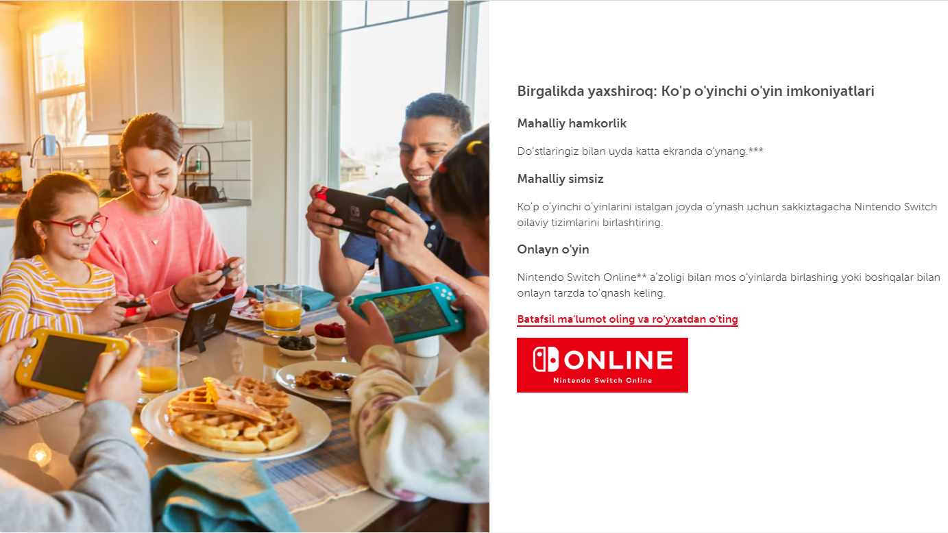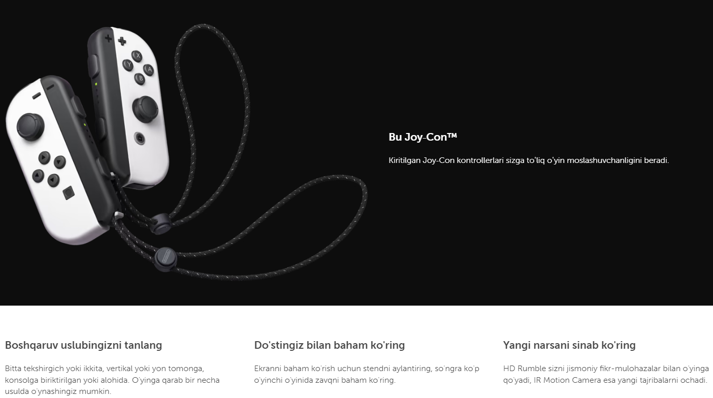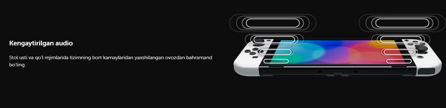 Nintendo Switch — da bo'lgani kabi, Nintendo Switch-Oled konsoli ham televizorda o'ynashga, shuningdek, birgalikda o'ynash uchun ajratilgan Joy-Con kontrollerlarini baham ko'rishga imkon beradi.