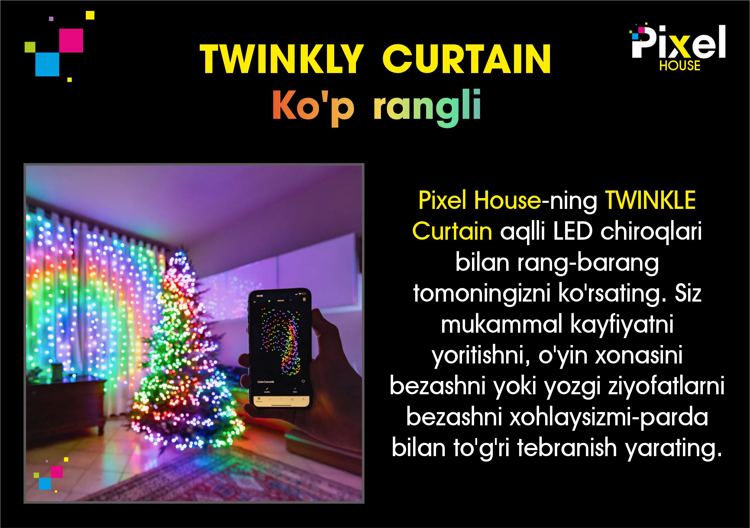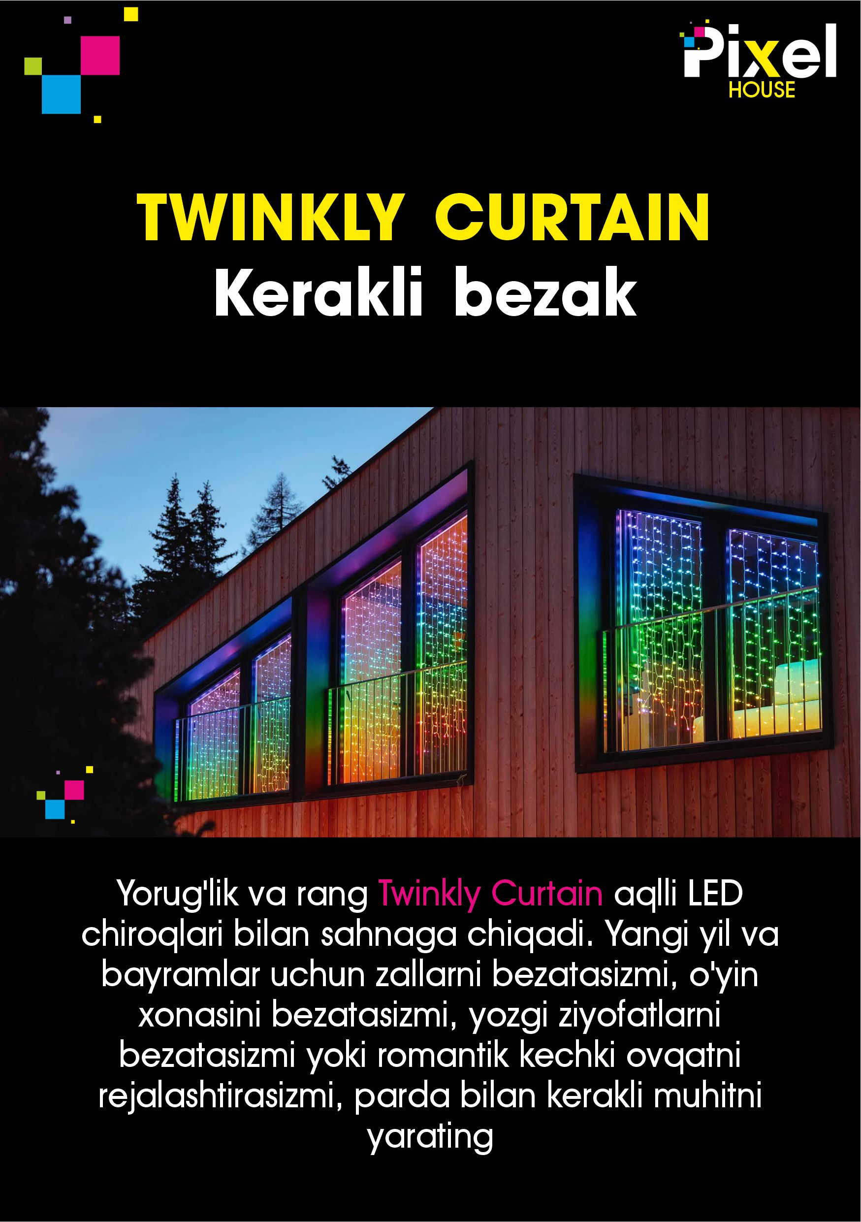 - Pixel House sizga eng yorqin, eng rang-barang va eng kuchli gulchambarlarni taqdim etadi! Haqiqiy yangi yil kayfiyati uchun uyingizni yoki ofisingizni qanday bezashingiz mumkinligini bilamiz!
