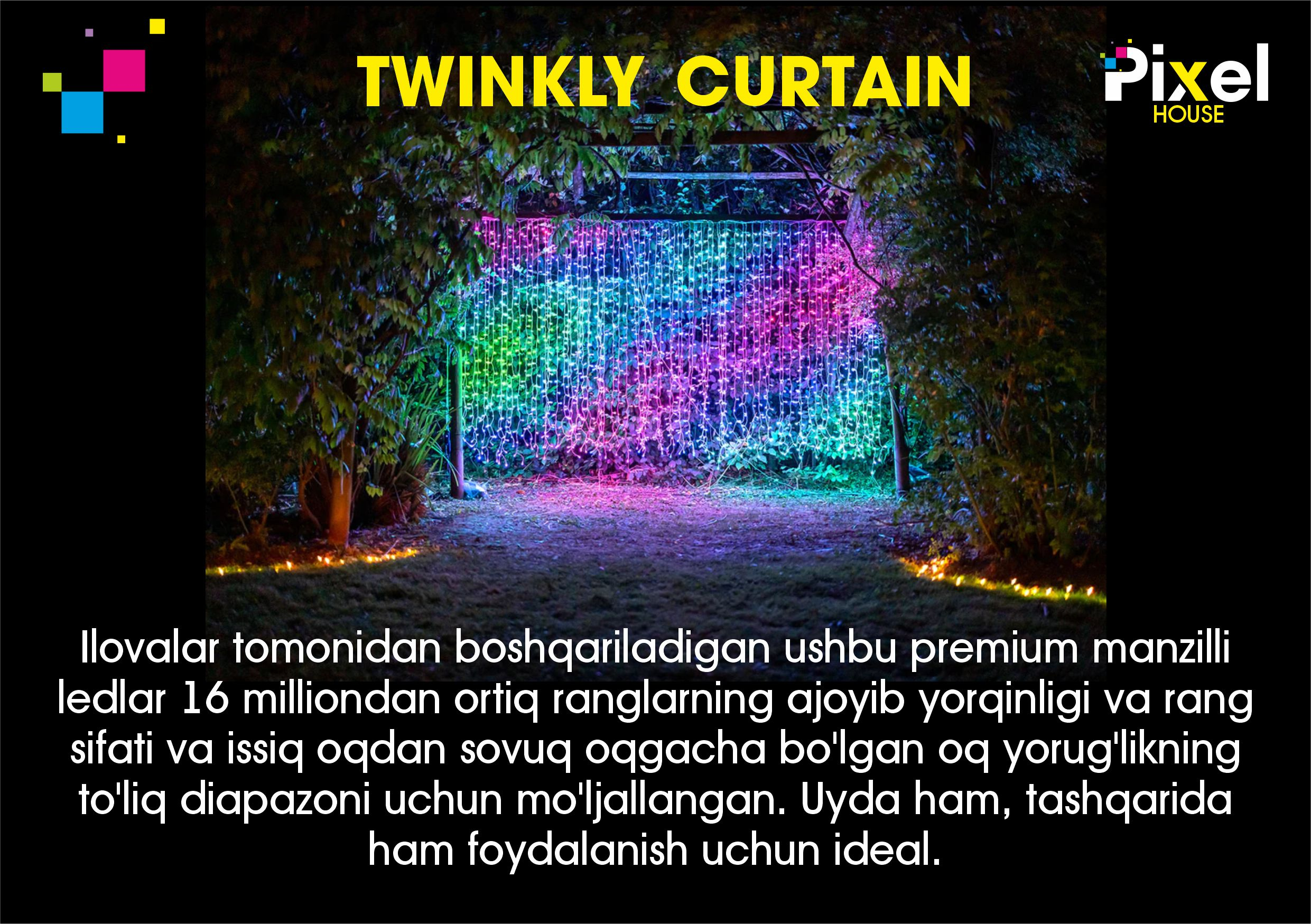 - Twinkly Curtain aqlli LED chiroqlari bilan rang-barang tomoningizni ko'rsating. Uyda ham, tashqarida ham foydalanish uchun ideal.