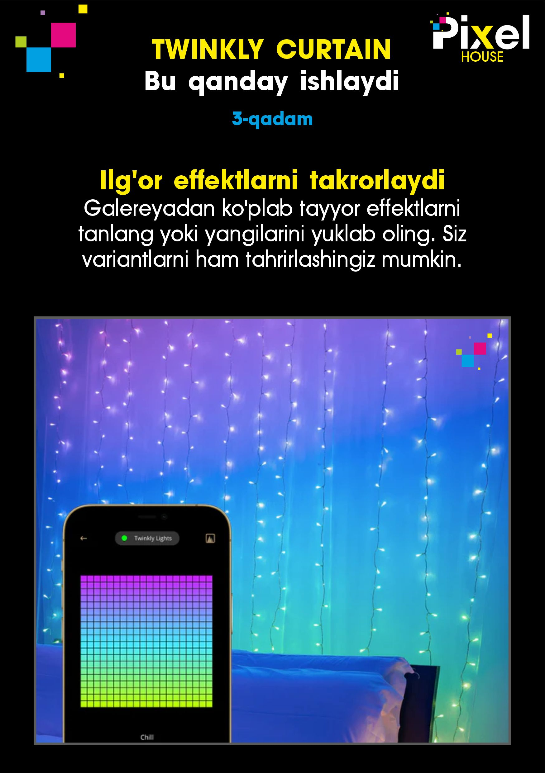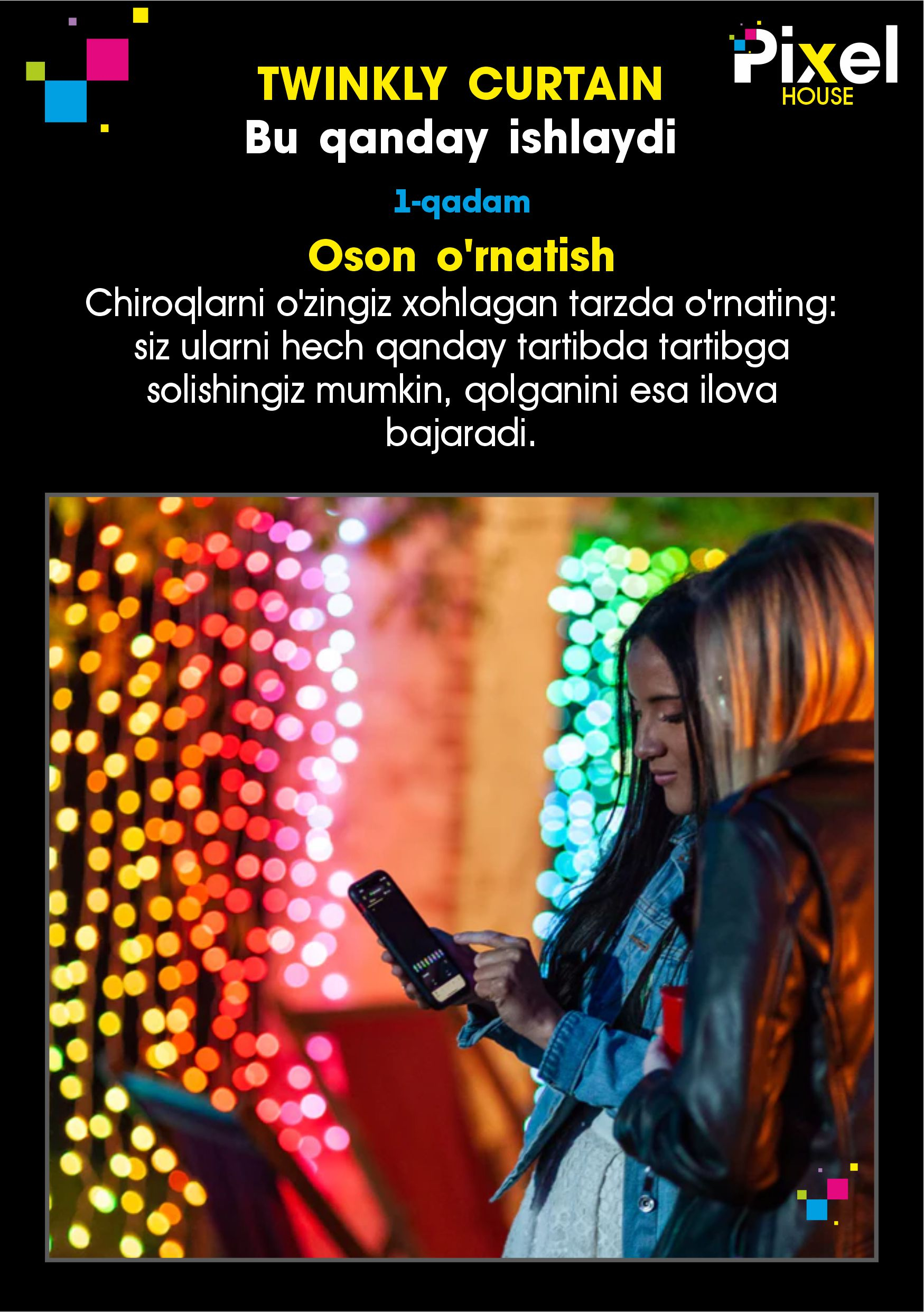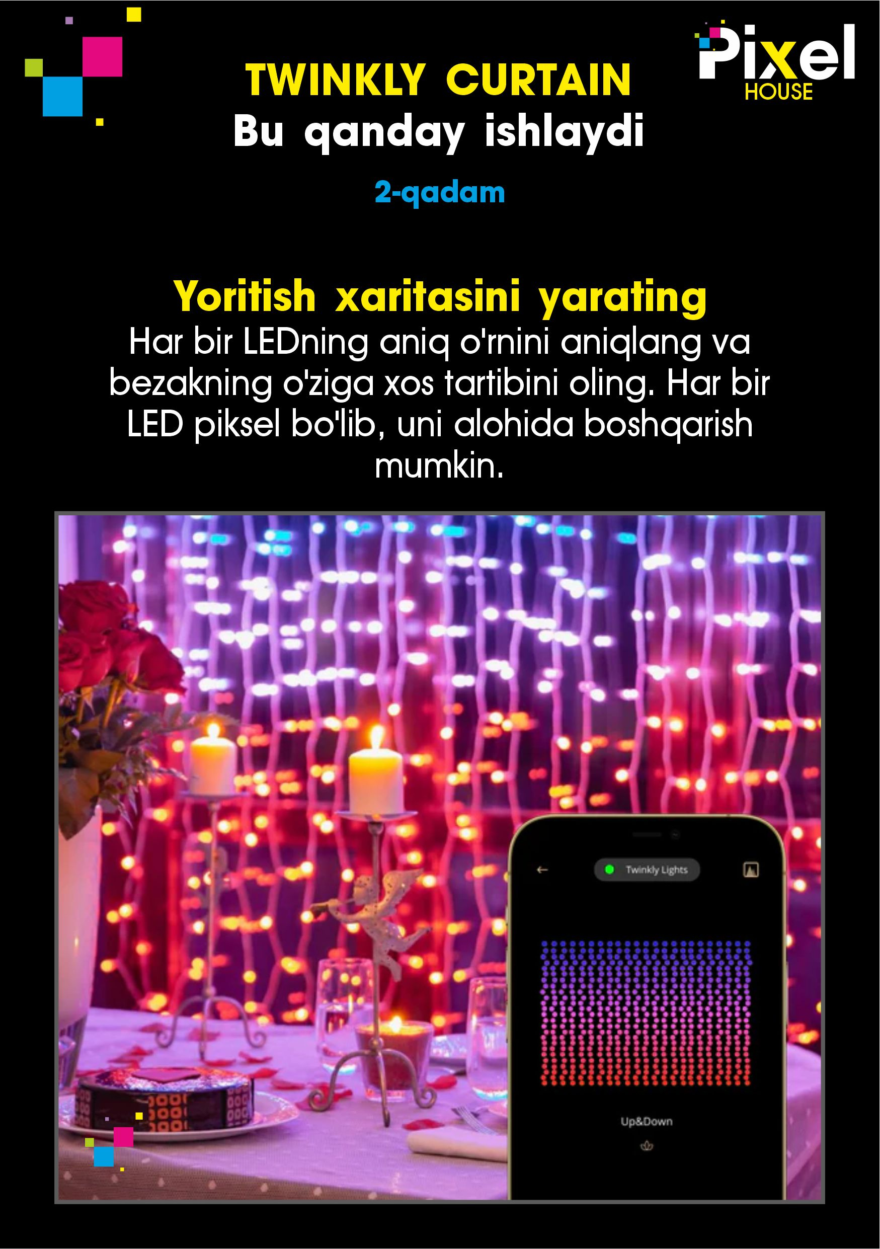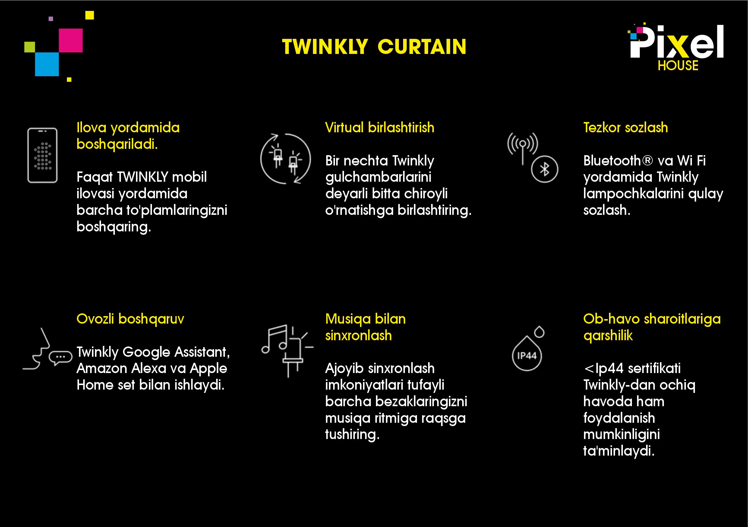 - Ilova yordamida boshqariladi. Faqat twinkly mobil ilovasi yordamida barcha to'plamlaringizni boshqaring. Twinkly Google Assistant, Amazon Alexa va Apple Home set bilan ishlaydi.