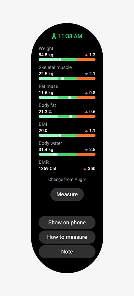Faqat tanangizning signallariga quloq solmang. U bilan yaqinroq tanishing. Tana tarkibi tahlili bilan birinchi Galaxy soatimiz yordamida fitnes taraqqiyotingizni kuzatib boring. Maqsadlaringizga erishish uchun tanangizda qancha yog ', skelet mushaklari, suv va boshqalar borligini bilib oling. Samsung BioActive sensori va bizning eng tezkor protsessorimiz yangi Galaxy Watch uchun innovatsion xususiyatlardir.