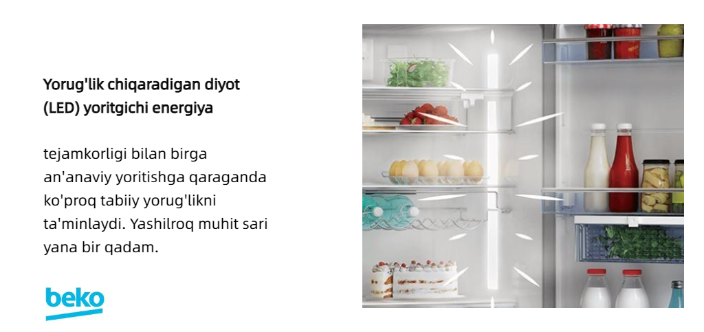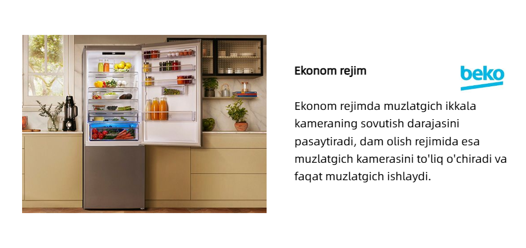 Sizga sig'imli va texnologik Beko muzlatgichini taqdim etamiz, u sizning oshxonangizning markaziy elementi bo'ladi. U mahsulotlarning yangiligini saqlash uchun innovatsion funksiyalar, yuqori energiya samaradorligi va zamonaviy dizaynni o'zida birlashtiradi, kundalik foydalanishda qulaylik va rahmatni ta'minlaydi.