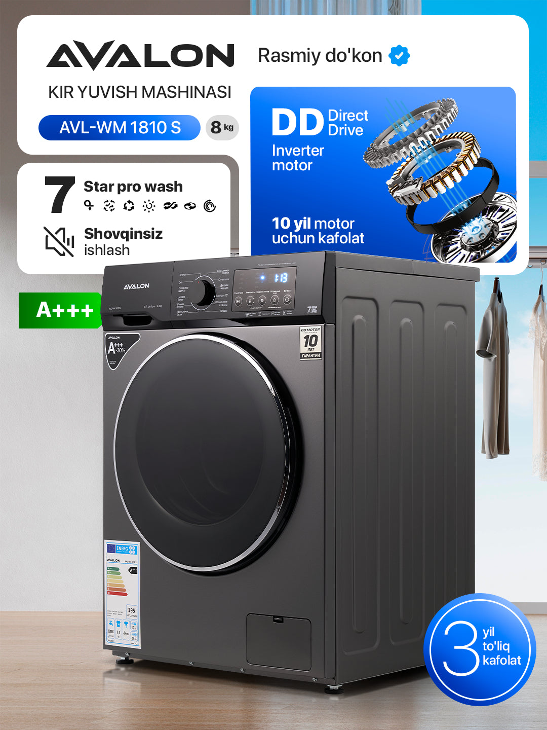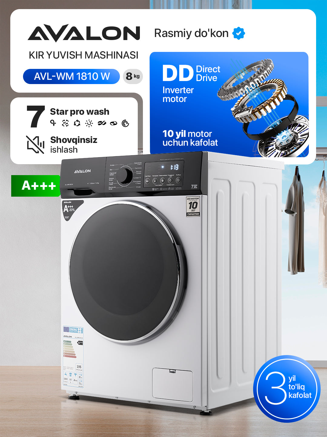 AVALON kir yuvish mashinalari nafis dizayn va ilg'or texnologiyani o'zida mujassam etgan. Ushbu kir yuvish mashinasi energiya samaradorligi A+++ sinfiga tegishli. Narsalarni samarali tozalash uchun mo'ljallangan. Ushbu model to'g'ridan-to'g'ri qo'zg'aluvchan inverter motoriga ega. U uzoq muddatli ishlash uchun mo'ljallangan, energiyani tejamkorlik bilan ishlatadi va deyarli jim ishlaydi.