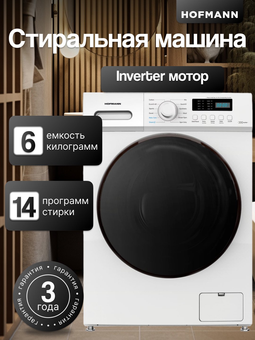 Kir yuvish mashinasi Hofmann WM610BWH2 / HF, 12 dastur, 6 kg, BLDC Inverter motor