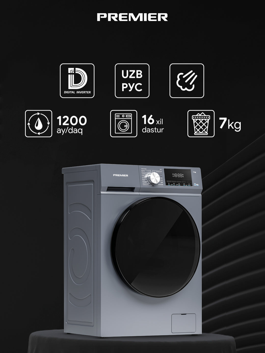 Kir yuvish mashinasi Premier PRM-70TC-06SF123064D, 7 kg, Invertor, bug' bilan yuvish