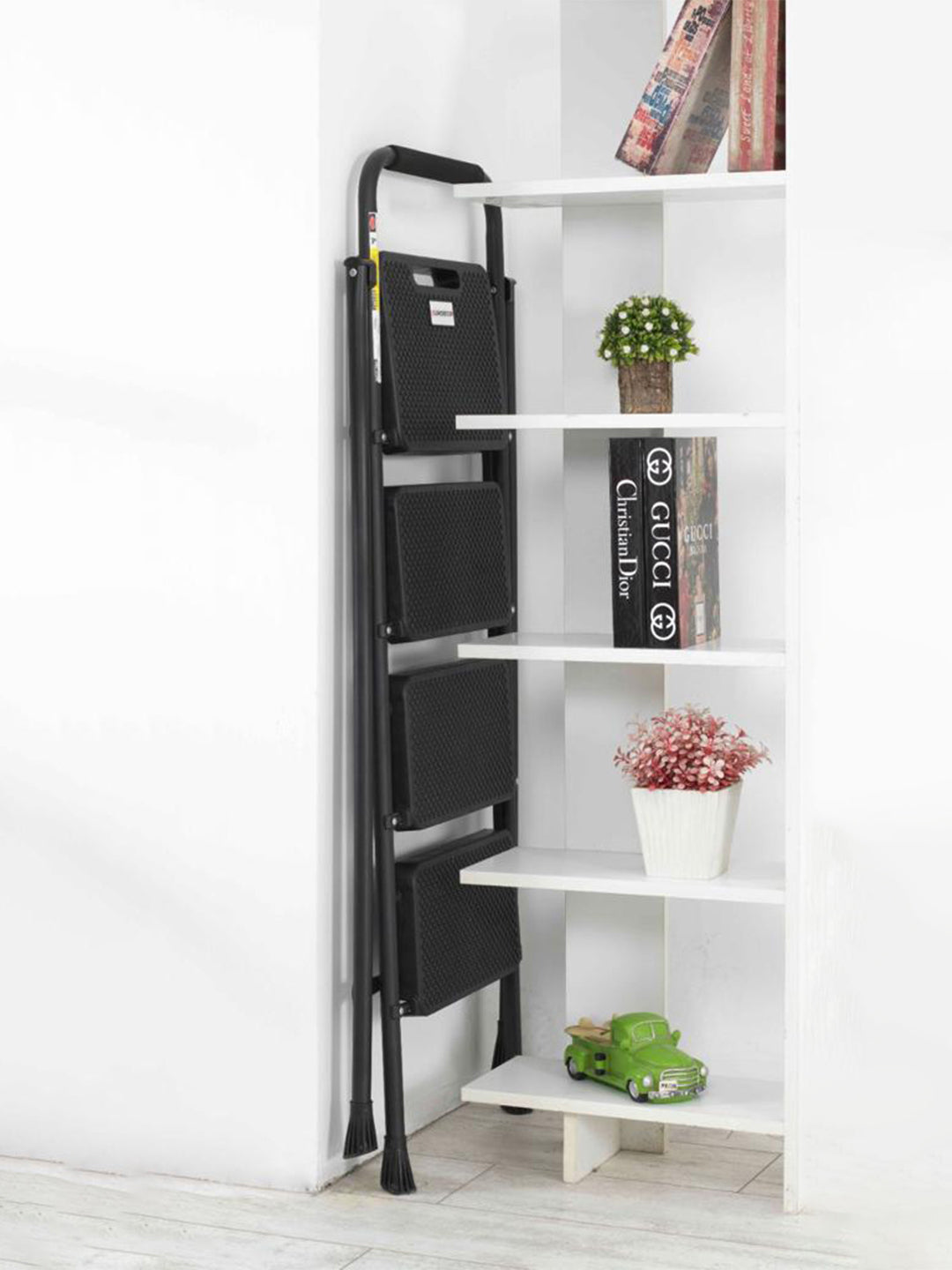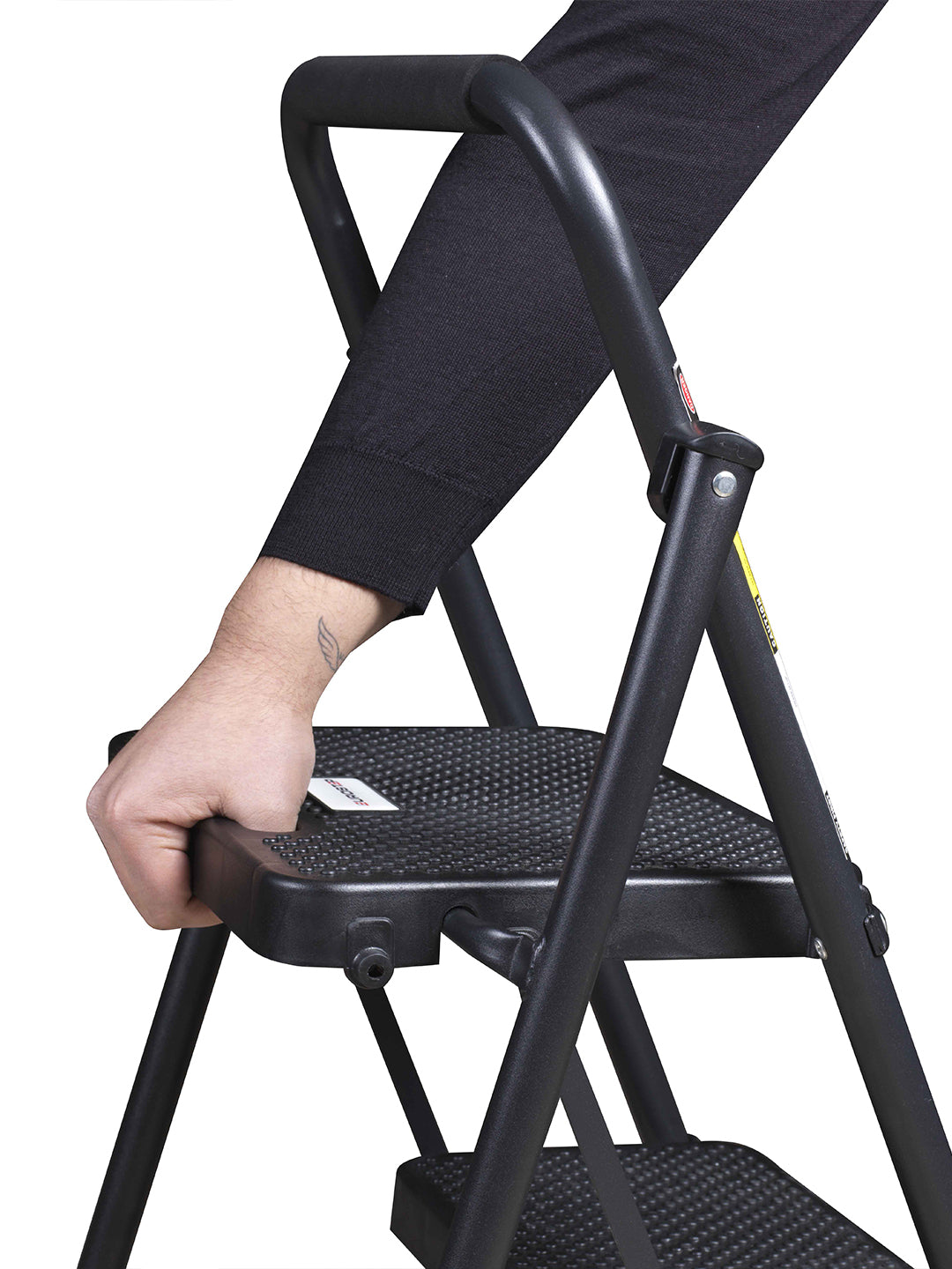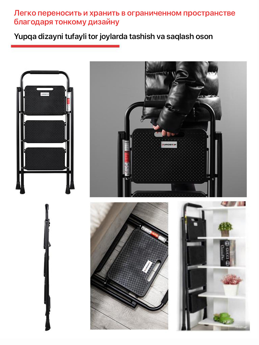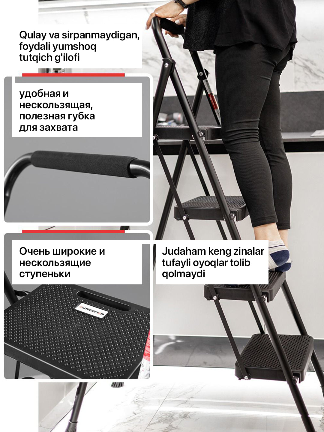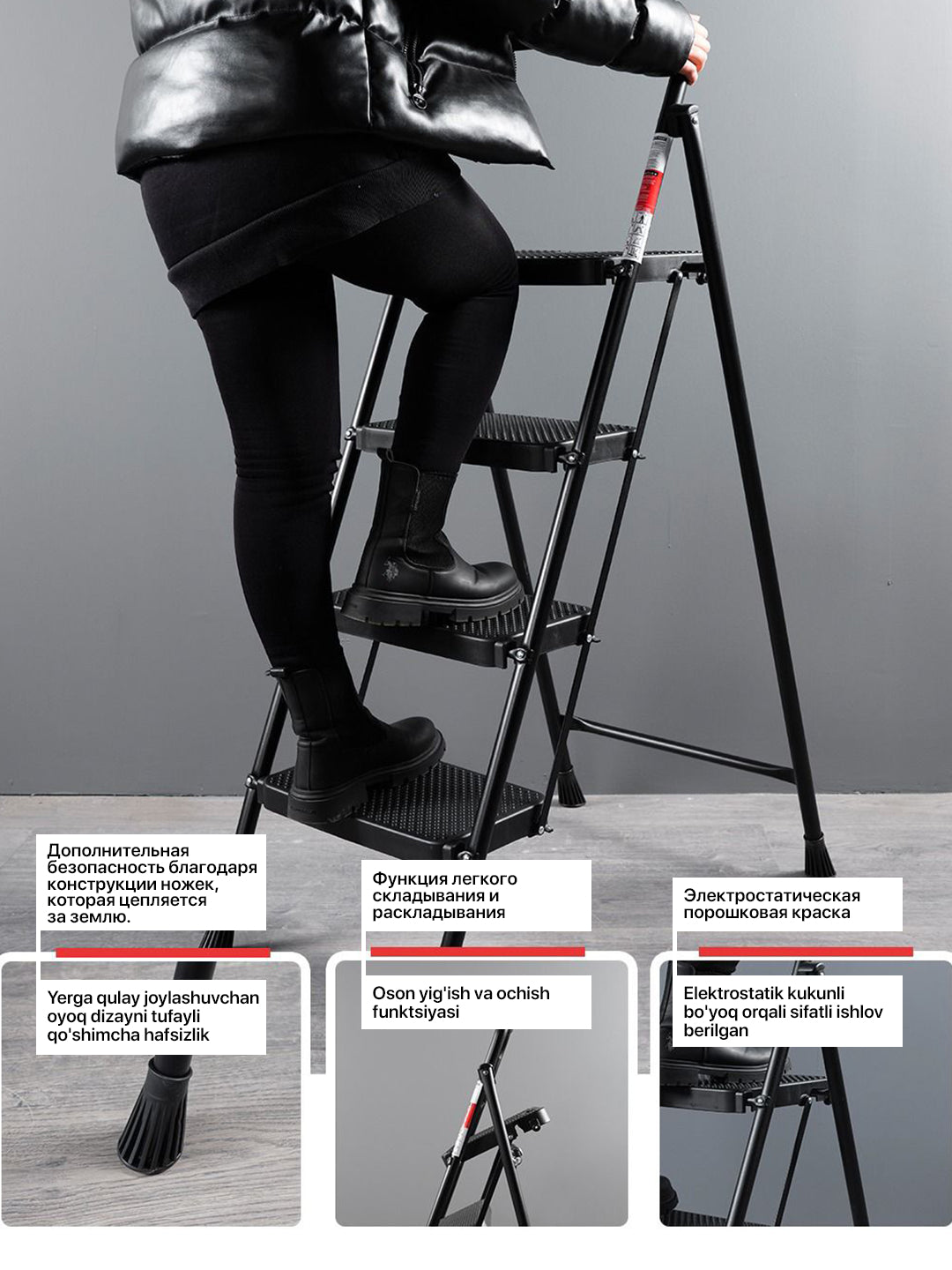 Evropa standartlari bo'yicha ishlab chiqarish Elektrostatik chang bo'yoq 150 kg chidamlilik Ergonomik tashish maydoni Sirpanishni oldini olish uchun maxsus mo'ljallangan plastik qoplamlar Po'lat menteşe tizimi bilan birlashtiruvchi xususiyat Yuqori darajadagi xavfsizlikka ega katta pog'onalar keng pog'onali zinapoya 4 zinapoya qora zinapoyalar nozik zinapoyalar mahsulot o'lchamlari