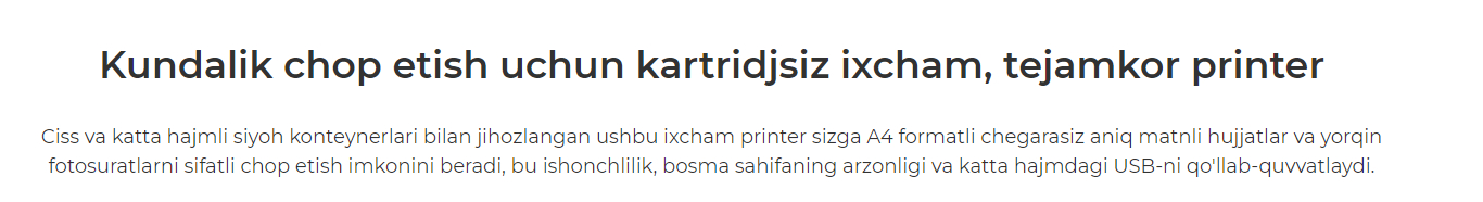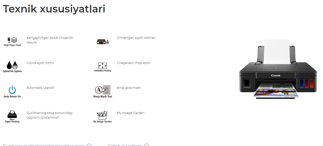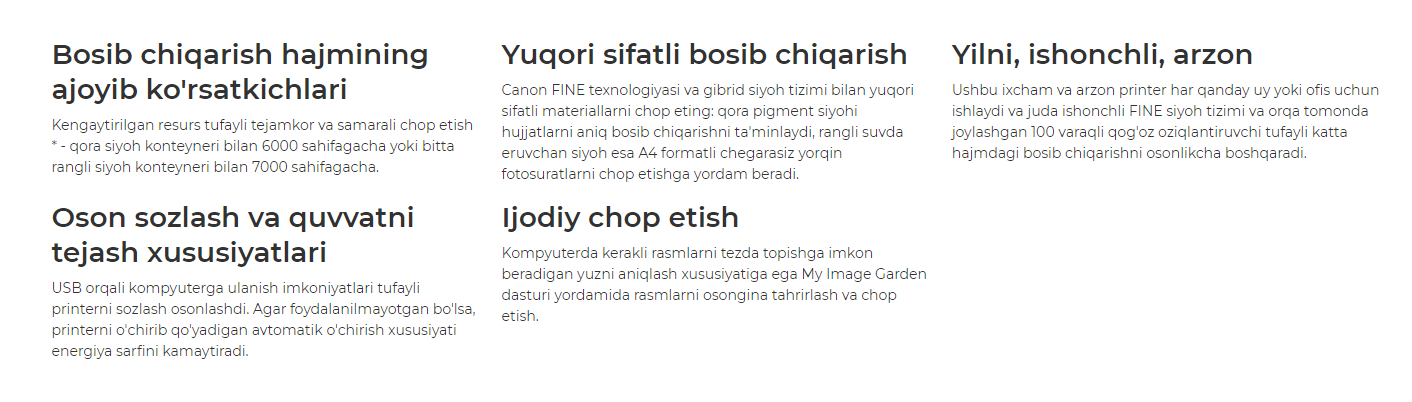 Matnli hujjatlarni chop etish tezligi daqiqada to‘qqiz sahifani tashkil qiladi va bitta fotosurat 60 soniyada tayyor bo‘ladi.