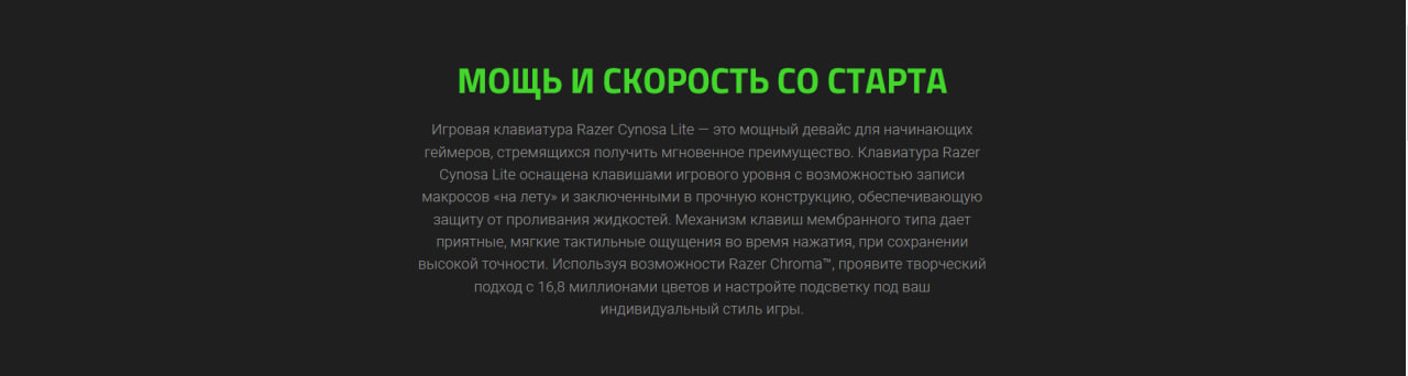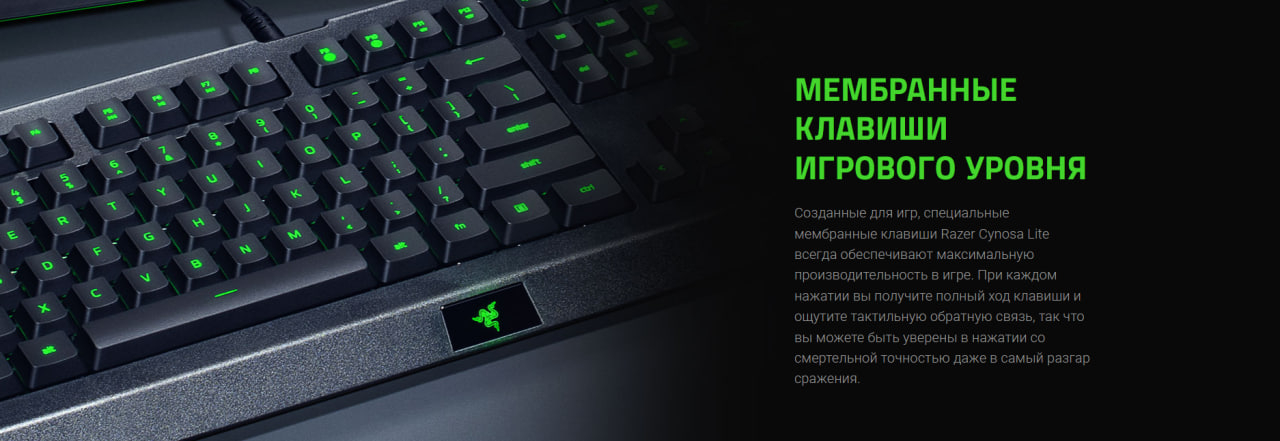 Razer Cynosa Lite o‘yin klaviaturasi bir zumda ustunlikka erishmoqchi bo‘lgan yangi o‘yinchilar uchun kuchli qurilmadir. Razer Cynosa Lite klaviaturasi oʻyin uchun moʻljallangan kalitlarga ega, soʻl yozuvlarni tez yozish va bardoshli, toʻkilmasin dizaynga ega. Membran tipidagi kalit mexanizmi yuqori aniqlikni saqlab, bosish paytida yoqimli, yumshoq teginish hissini ta'minlaydi. 16,8 million rang bilan ijodkor bo‘lish va shaxsiy o‘yin uslubingizga mos yoritishni sozlash uchun Razer Chroma™ quvvatidan foydalaning.