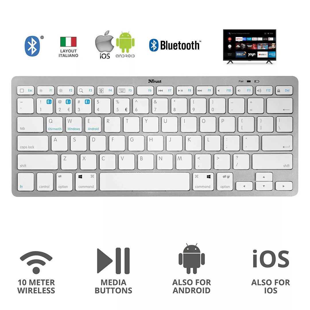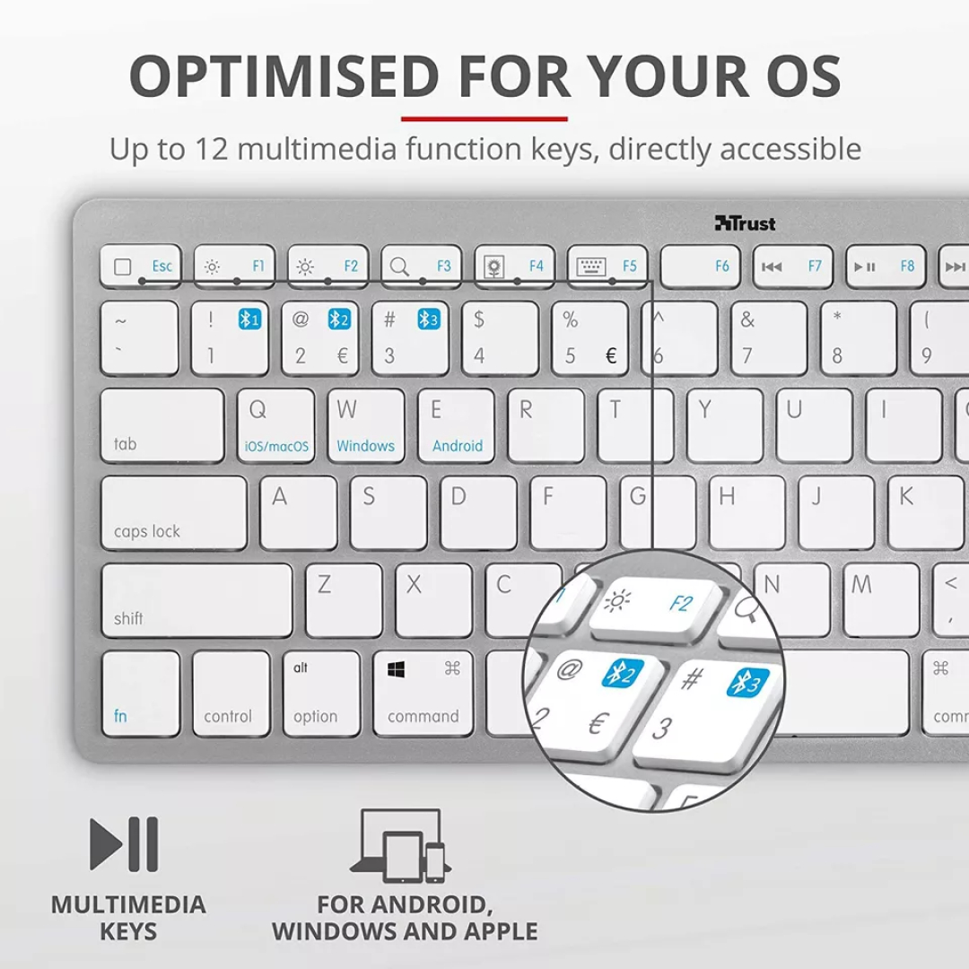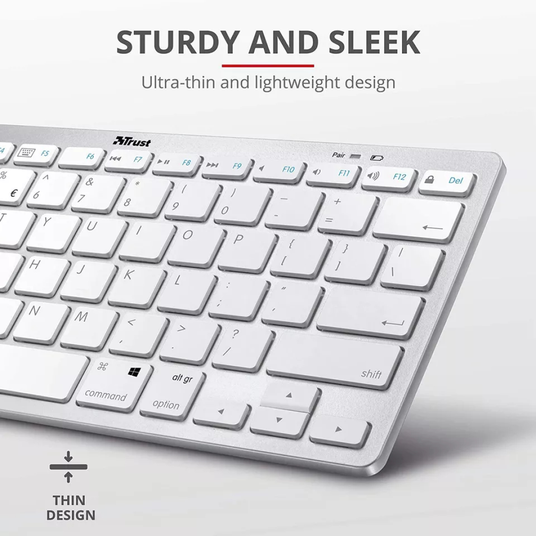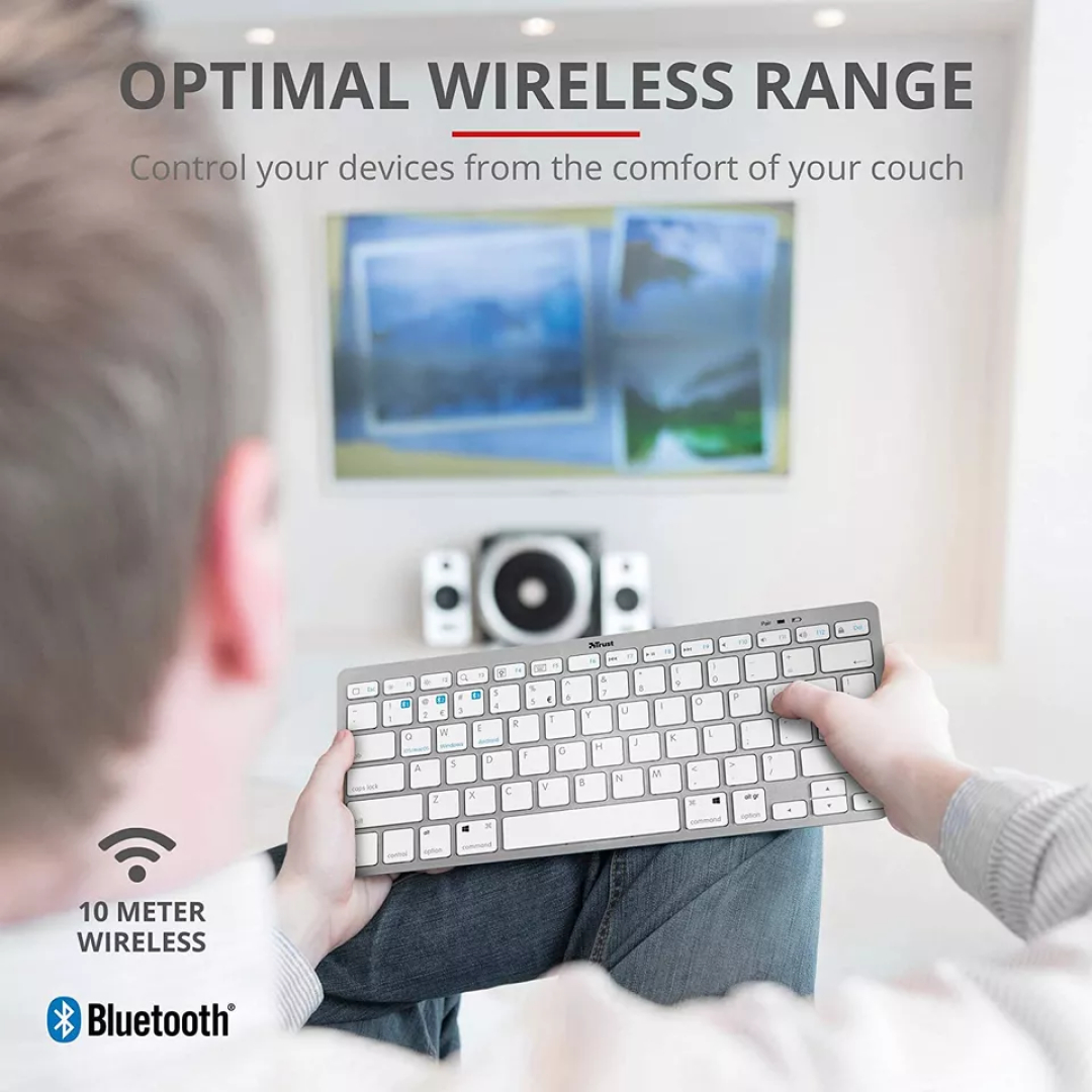 "Trust Bluetooth" simsiz klaviaturasi - bu o‘ta nozik va yengil klaviatura bo‘lib, u raqamli texnologiyalarga tayyor uyingiz yoki mehmonxonangizga zamonaviy qo‘shimcha bo‘ladi. Uning past profilli izolyatsiyalangan tugmalari unga minimalist va nafis uslub beradi; matn terish oson bo‘ladi.